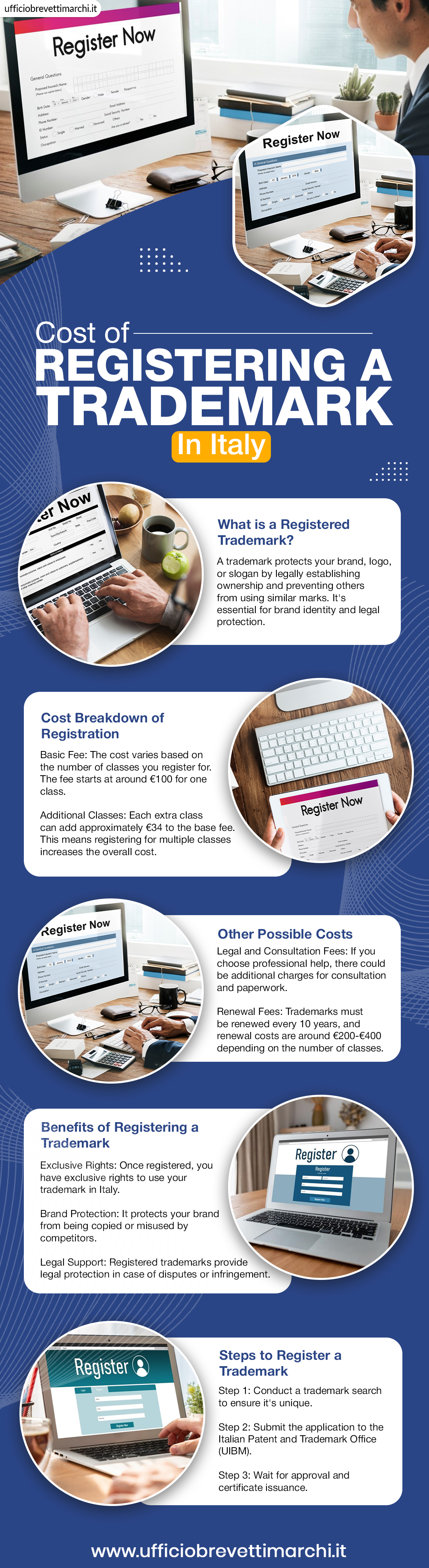 Contattate l’Ufficiobrevettimarchi.it per avere informazioni dettagliate e per avere una guida personalizzata che vi aiuterà nel processo. https://www.ufficiobrevettimarchi.it/utilita/costo-registrazione-marchio/